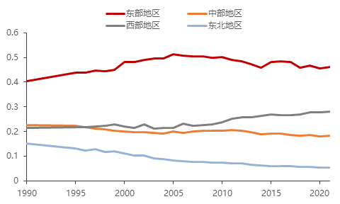 导致珠三角竞争力转弱的主要原因是要素价格上升,主要是土地和劳动力,部分劳动密集型产业外迁至东南亚国家,部分则内迁到中西部地区。从我国东部、中部、西部和东北四大区域看,2018年至今,东部对外出口贸易的份额从81.7%降至79.8%,中部从8.2%上升至9.1%,西部从8.2%升至9.0%,东北则从2.5%降至2.1%。尽管地区间出口的变化份额不算大,但多少也可以解释珠三角地区农民工数量减少和西部地区人口流入增加的部分原因。