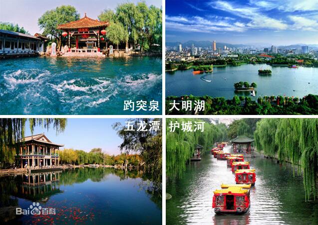 护城河、大明湖、趵突泉、黑虎泉、五龙潭、趵突泉公园、环城公园、五龙潭公园、大明湖风景区等旅游胜景。