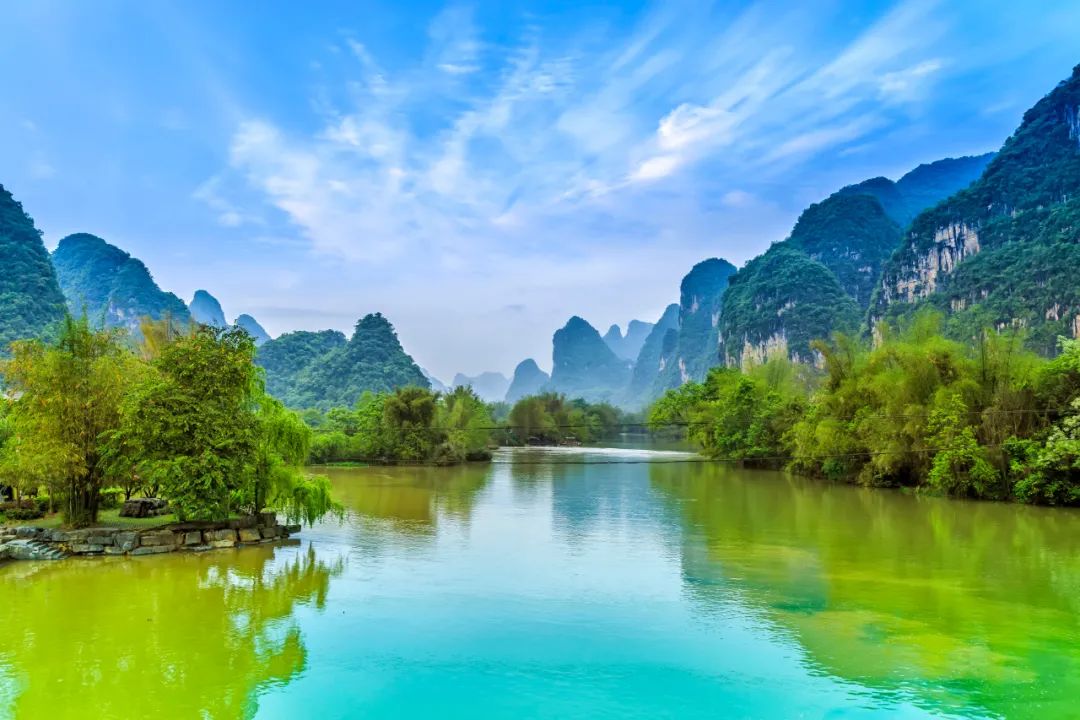 桂林到阳朔之间,83公里长的漓江,人称“百里画廊”。作为世界上规模最大、风景最美的岩溶山水游览区之一,船行漓江上,所谓“群峰倒影山浮水,无山无水不入神”“分明看见青山顶,船在青山顶上行”,这是漓江独具一格的特色。
