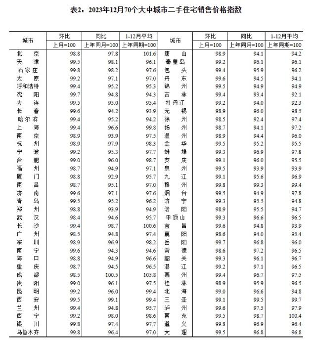 2023年12月70个大中城市二手住宅销售价格指数。 截图自国家统计局官网